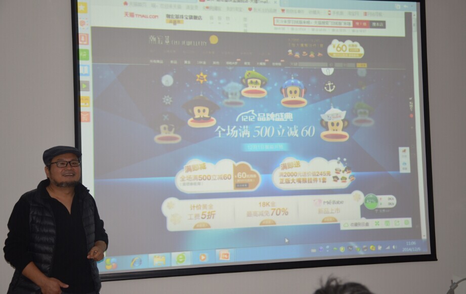 12月6日上午,讲师孙传强围绕视觉营销,结合潮宏基、天际电器、费雪牌等品牌天猫店首页的实际案例,为学员们传授了摄影技巧、色调对比、品牌策略、网店经营等知识和经验。他强调,关于淘宝店首页的布局,一定要具备三点:一是色彩一定要有视觉张力,要注重对比调和和过渡;二是产品的设计要有一条主线,追求简洁,三是要突出品牌。
