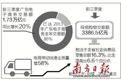 副省长招玉芳在致辞中强调,广东电商的发展显示出了强劲的势头:去年,广东电子商务的交易额突破了两万亿元,今年前三季度就达到了1.73万亿元,增长了20%,其中限额以上的企业通过互联网实现了商品的零售额大幅增长,增长了69.6%,电商带动了快递业务量的猛增,增长了58%。