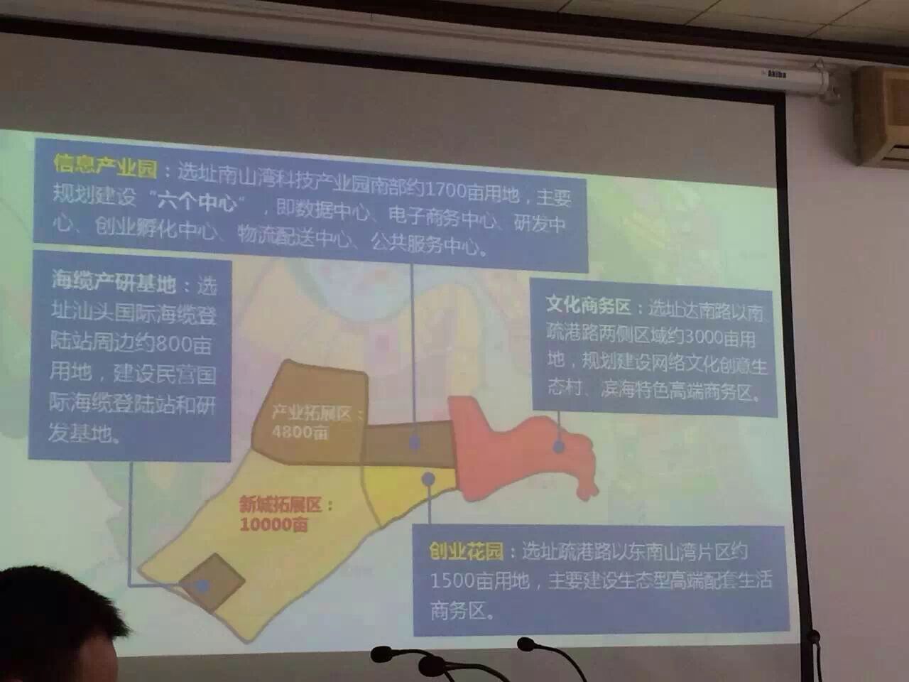 1、 濠江是汕头唯一一个有山有水的地方,整体规划比较好。定位汕头后花园,即是传统产业转型的’服务后花园,濠江的以海底光缆的优势建成汕头的服务后花园。另外从大数据出发,大家都在修信息高速公路,未来全国大规模的发展是传统企业的转型。