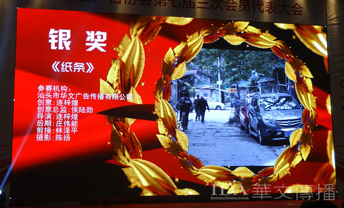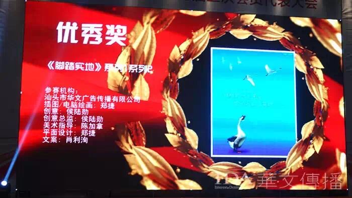 汕头参赛作品共获得三个奖项:IDA华文传播影视作品《纸条》荣获影视公益类银奖,这也是本届大赛汕头唯一获得最高奖项的作品;华文参赛的平面设计作品《脚踏实地》系列与林毅广告作品《让世界了解潮味》系列同获自由创作类优秀奖。华文传播总部管理部代表上台领奖。
