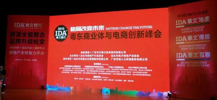 2月7日下午,由广东华文联行投资顾问有限公司独家赞助,汕头市电子商务产业协会、汕头市房地产行业协会联合主办,汕头市英盛企业管理顾问有限公司、广东百城人力资源服务有限公司协办的“格局改变未来——2015粤东商业体与电商创新峰会”在汕头市林百欣会展中心大会堂举行。