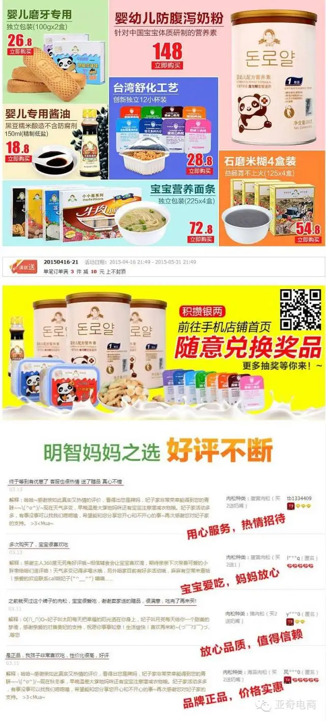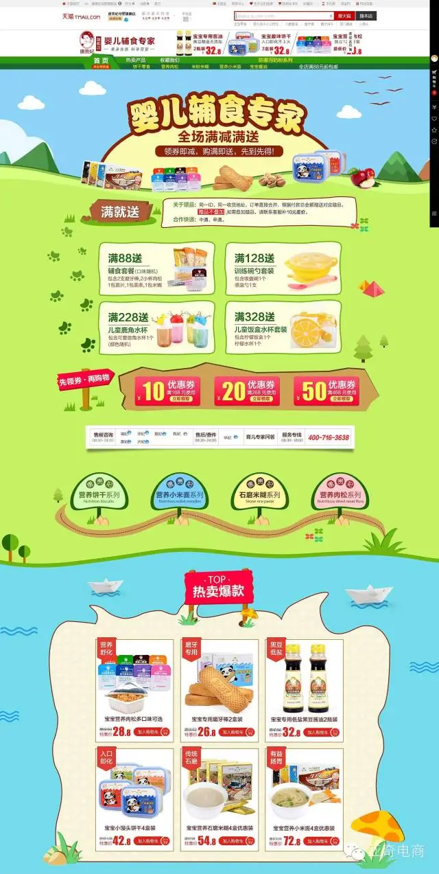制定全店的整体营销方案,以单品突破,不断优化,并根所市场变化不断改进营销战术,使产品销量不断提升。如一个婴儿肉松,原定价20元,我们直接定价42元,进行买1送的促销活动,产品一下子打开销量,第二阶段买2送1,直接提高了产品的净利(配海报2及营销主图2)