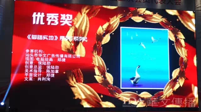 汕头参赛作品共获得三个奖项:IDA华文传播影视作品《纸条》荣获影视公益类银奖,这也是本届大赛汕头唯一获得最高奖项的作品;华文参赛的平面设计作品《脚踏实地》系列与林毅广告作品《让世界了解潮味》系列同获自由创作类优秀奖。华文传播总部管理部代表上台领奖。