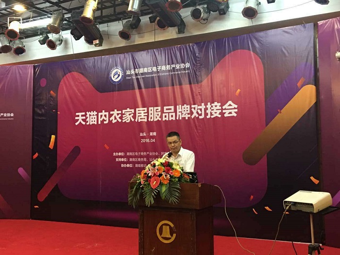 4月21日,潮南电子商务产业协会邀请天猫服饰代表在潮南金佳诚酒店举办“天猫内衣家居服原产品牌对接会”。会上,潮南区委常委王楚彬介绍了潮南内衣产业目前的发展趋势,同时对接下来潮南电商企业与天猫的合作充满信心。