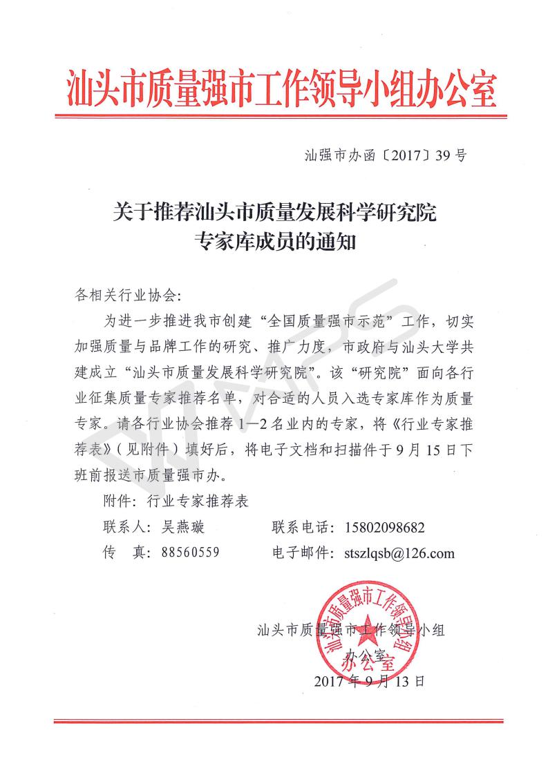 关于推荐汕头市质量发展科学研究院专家库成员的通知