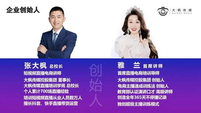 大枫传媒直播培训学苑由大枫老师于2018初创办,历经5年多实践、研发和实战训练在不断完善教学体系基础上,创立了一套在行业内及社会各界公认的电商主播职业技能课程。同时,由公司共同创始人雅兰老师所独创的“电商主播速成训练法”已成为行业争相模仿的标杆。目前,大枫传媒已在深圳、东莞、广州、北京、重庆、佛山、长沙、 萍乡、武汉、汕头等22个城市设立分校;累计开课千余场,培训各类型带货主播、运营、短视频及直播专业技术从业人员三万多人,帮扶陪跑代运营企业300余家,孵化企业账号1000余个。大枫传媒全体同仁踏实做事,用心服务赢得了社会和媒体的一致认可。